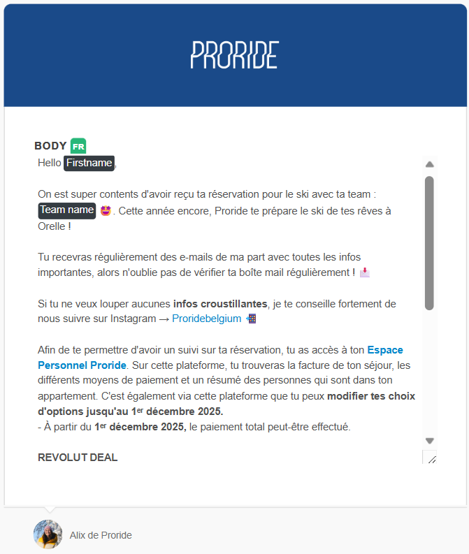 J'ai pris en charge une partie essentielle de la communication digitale : la gestion et la préparation des emails envoyés aux vacanciers, depuis leur inscription jusqu'à leur rétribution de caution. Mon rôle consistait à rédiger, structurer et organiser une série de messages couvrant toutes les étapes du séjour.