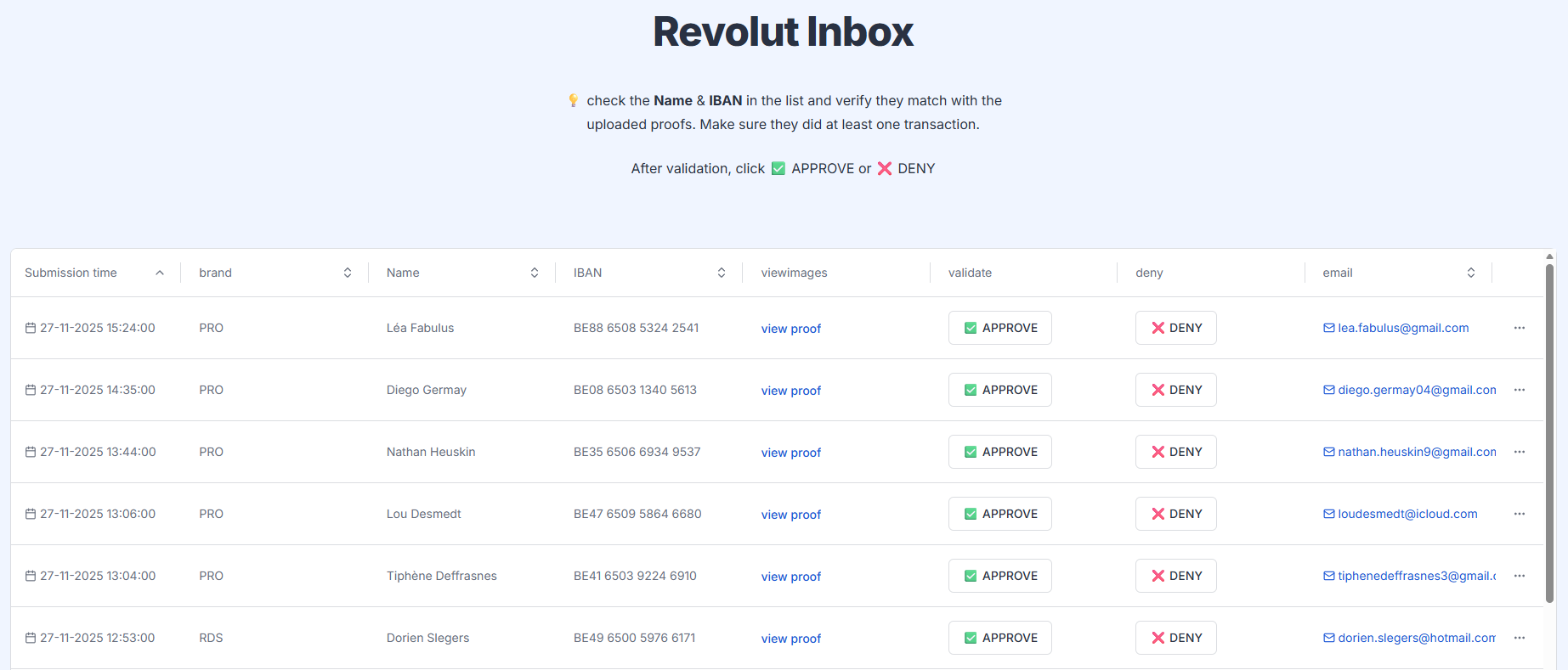 Je me suis aussi occupé de la validation du deal Revolut, l'un de nos partenaires principaux cette année. Pour chaque participant, je recevais deux preuves photo via une plateforme centralisée. Ma mission consistait à vérifier l'exactitude des informations transmises : le nom et le prénom, l'IBAN, ainsi que la réalisation d'une transaction d'au moins 1 €. Cette étape garantissait que seuls les vacanciers ayant correctement rempli les conditions bénéficiaient du partenariat.